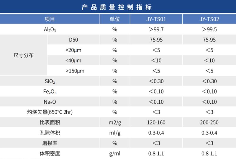 晶型:γ-Al2O3 物理性质:本品无毒、无味、无嗅、不溶于水和乙醇。 产品简介:JY-TS脱氢催化剂载体具有低磨损、粒径分布集中等特点,产品粒径分孔容、比表面积等指标可根据要求调整,通常用于流化床。
