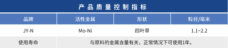 JY-N催化剂是一种重油加氢脱硝催化剂。适用于重油和其他劣质馏分油的加氢处理工艺,其主要作用是深度脱除原料油中的硫和残炭,适度加氢转化。 JY-N催化剂具有芳香饱和、脱碳、脱硫、高脱氮和适度加氢裂化(转化)的功能。